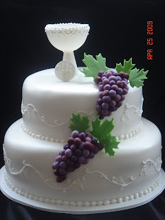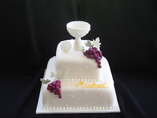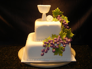 Tiered square communion cake with chalis,Host and grapes bunches $ 160 -grapes on wire